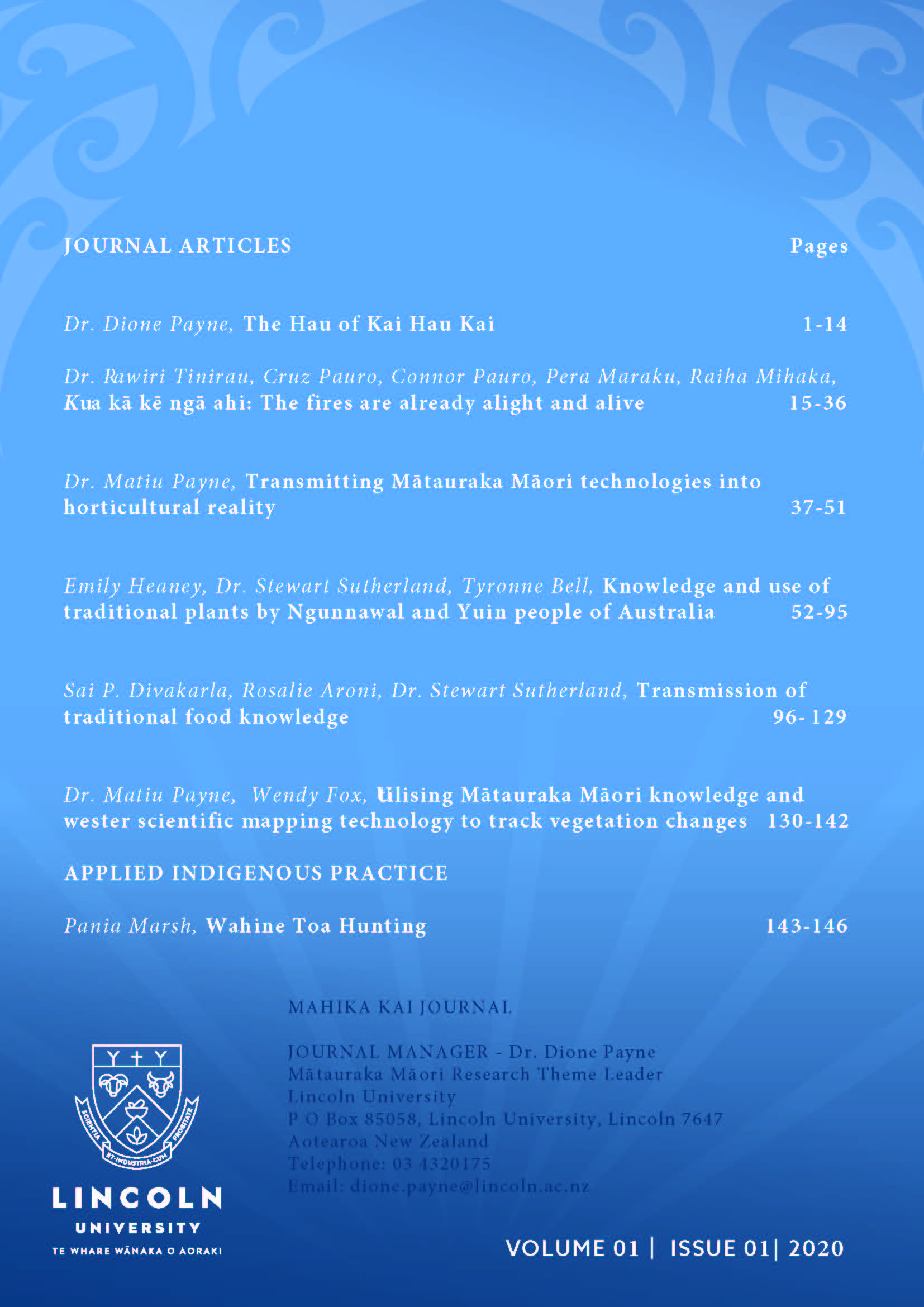 This first issue of the Mahika Kai Journal includes some of the presentations from the Mahika Kai Conference in 2019. Contributors include mahika kai practitioners and researchers from Otautahi, Whanganui, Manawatu and Te Whenua Moemoea (Australia).